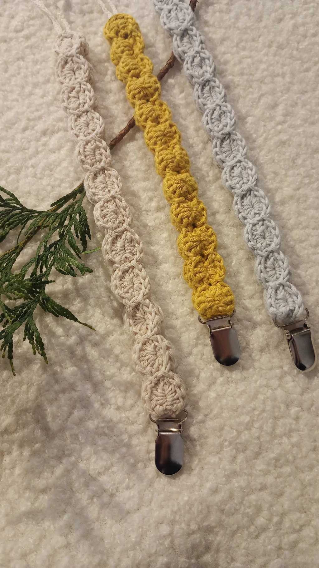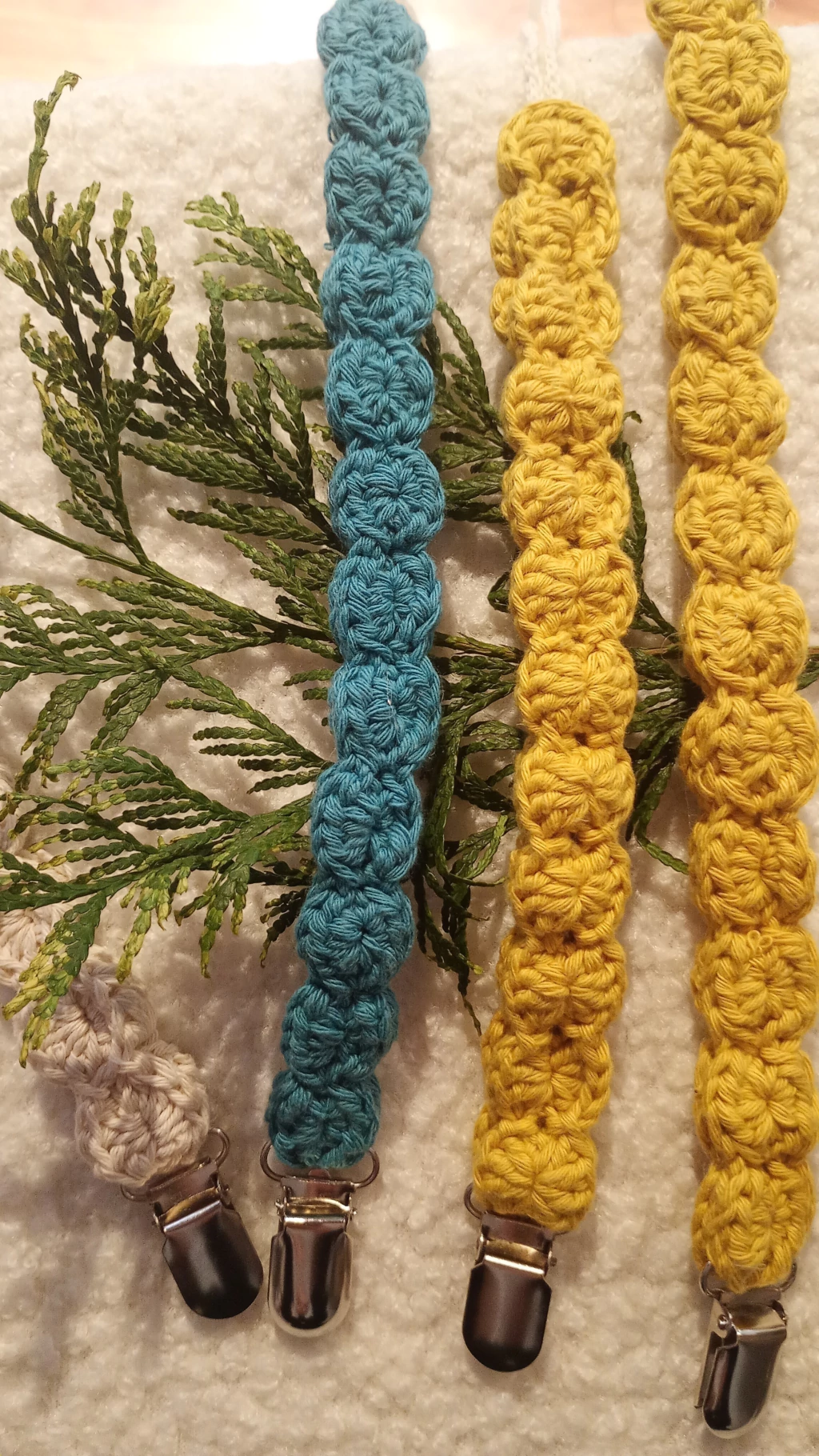 Hechos a mano con amor, estos portachupetes de crochet son ideales para recién nacidos gracias a su textura suave y liviana, pensados para cuidar la piel sensible de los más chiquitos.